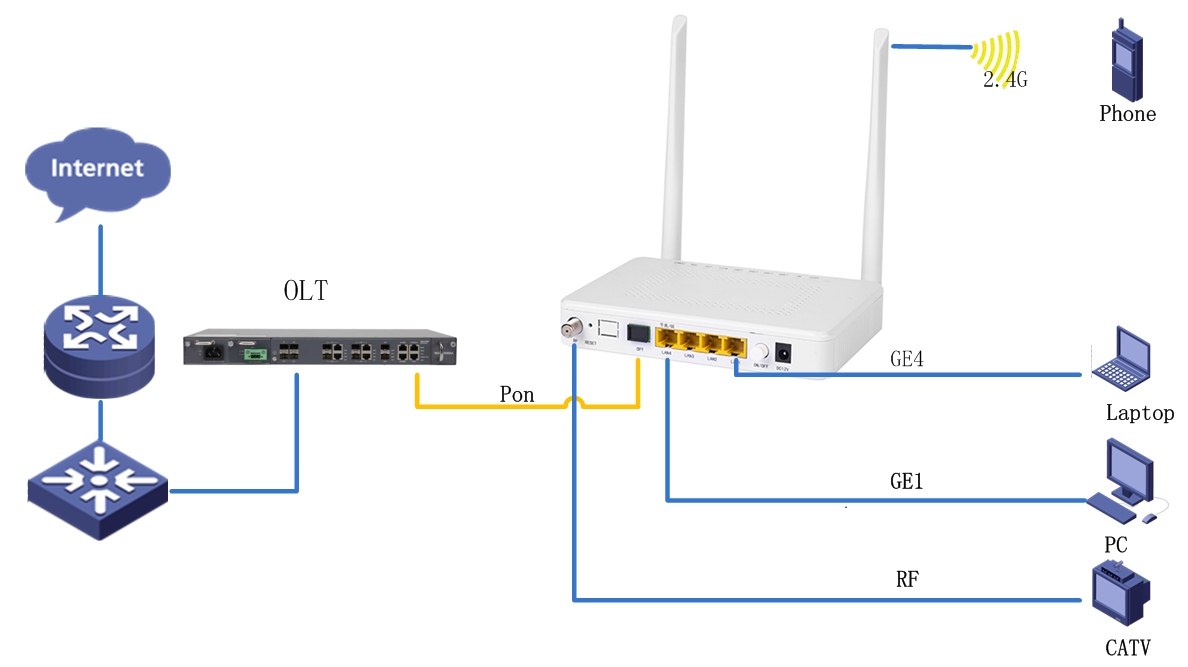 It configures one 10/100/1000Mbps port,three 10/100Mbps ports, WiFi (2.4G) port and RF interface that providing with high-speed data services and high-quality video services to users. Features         Compliance with IEEE 802.3ah(EPON) & ITU-T G.984.x(GPON) standard
